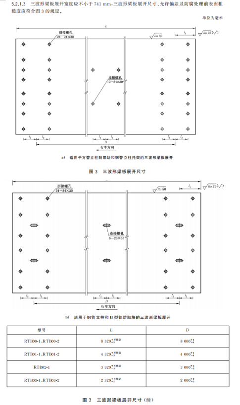 m) 增加了三波形梁板中部連接螺孔數(shù)量應根據(jù)鋼管立柱間距設置的要求、展開尺寸及允許偏差的要求(見5.2.1.1~5.2.1.3);